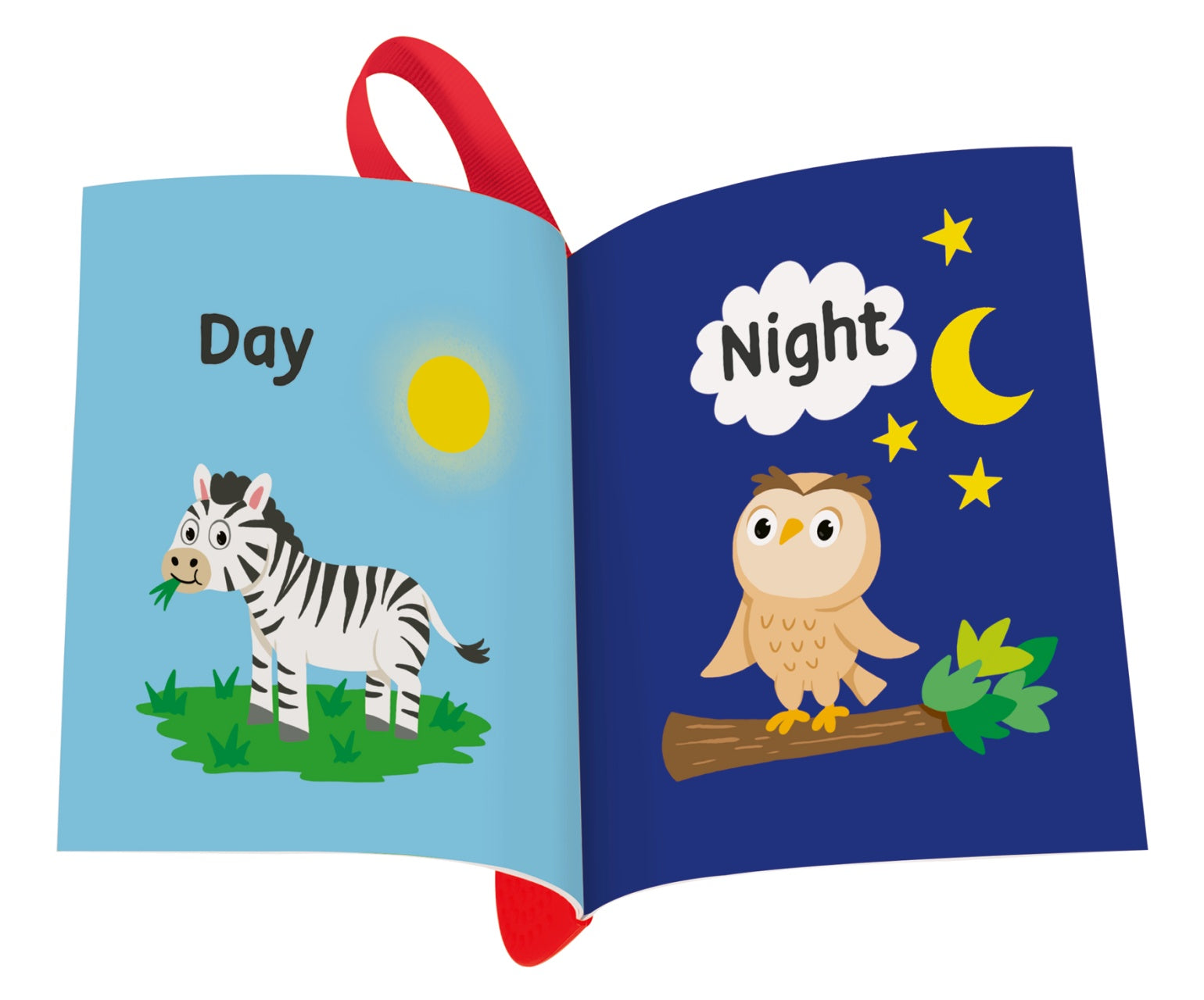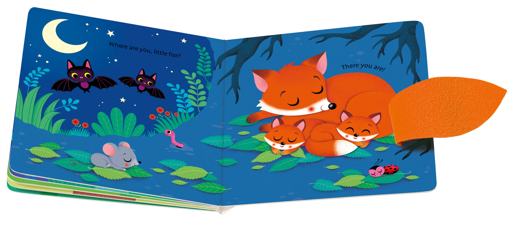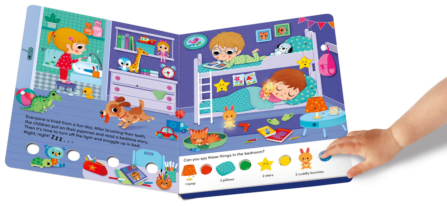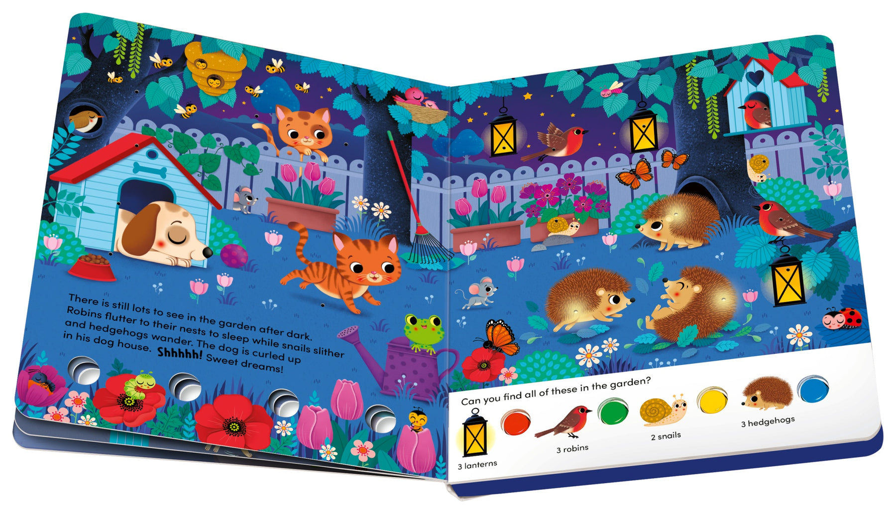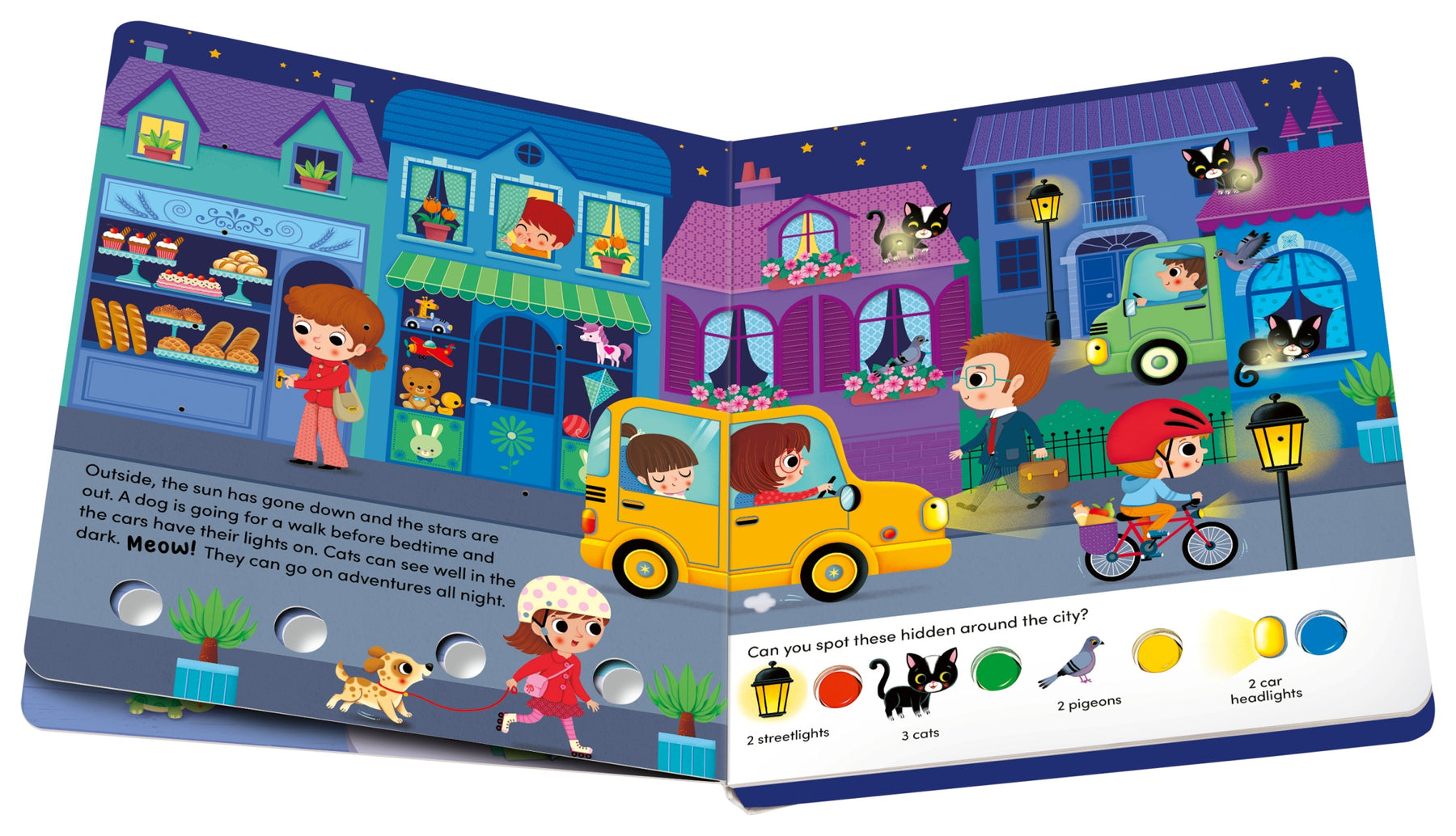 Cardboard book with five double pages, each with a different night-time scene. You then have to find specific things, the owls or the streetlights for example. When you've found them, press the button at the bottom of the page and little lights will shine to show where the items are.