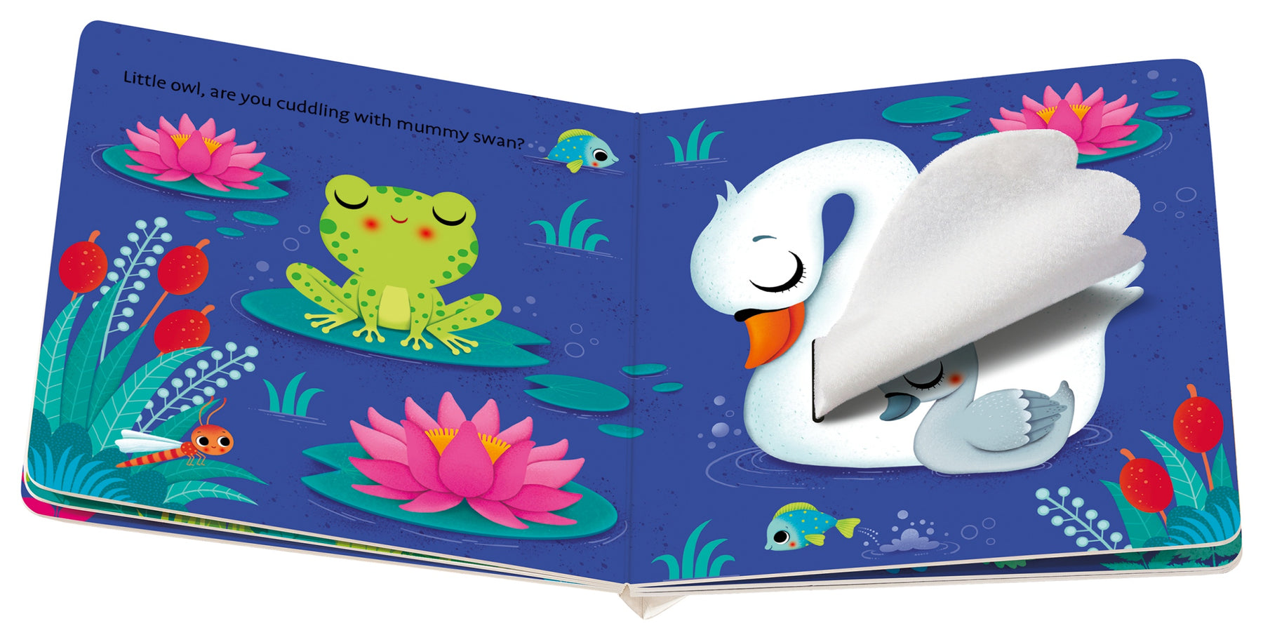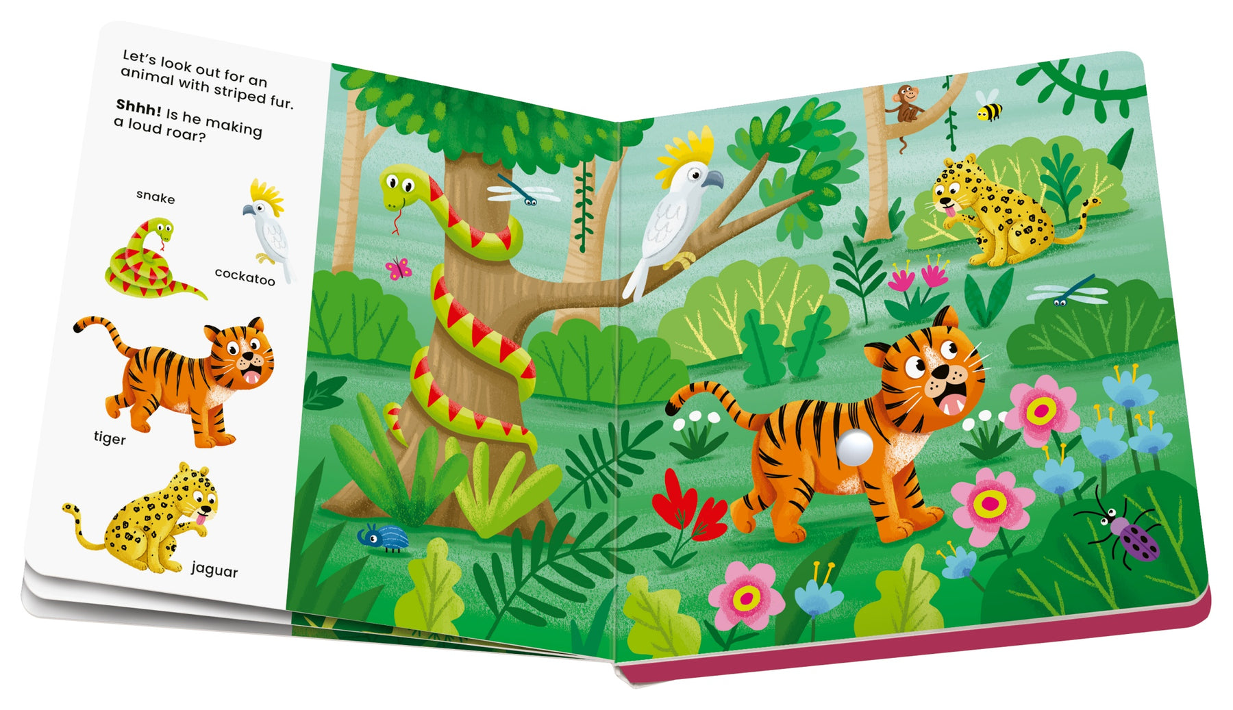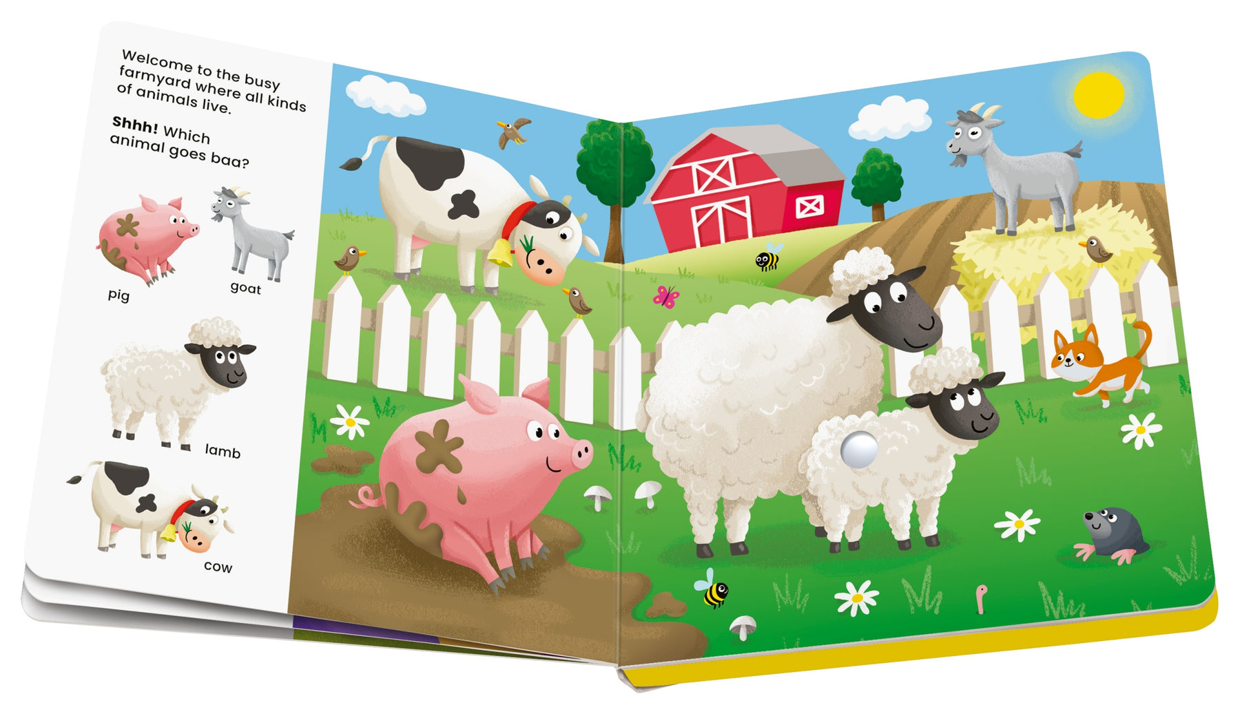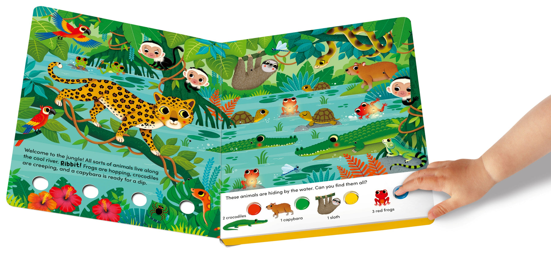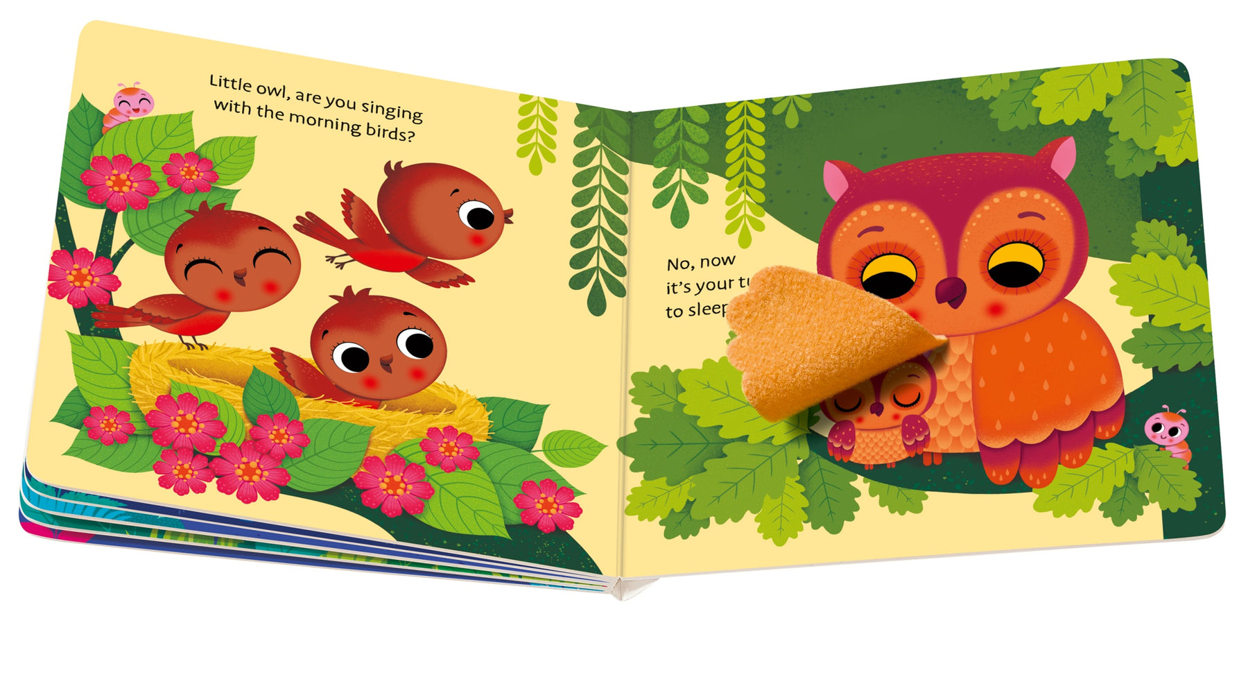 Cardboard book with five double pages, each with a different night-time scene. You then have to find specific things, the owls or the streetlights for example. When you've found them, press the button at the bottom of the page and little lights will shine to show where the items are.