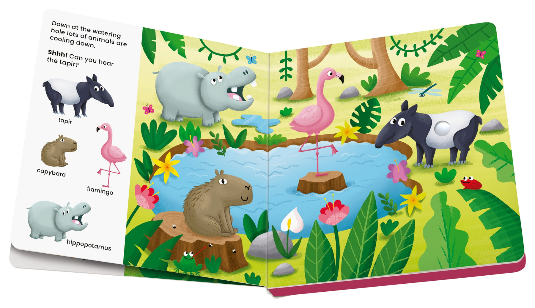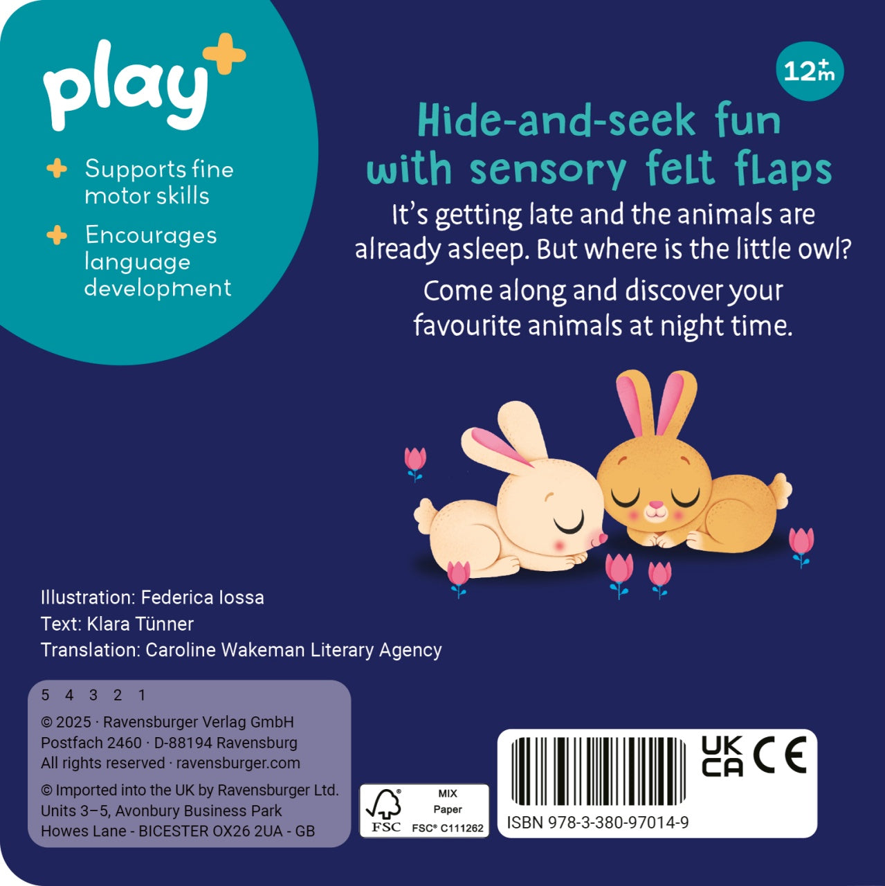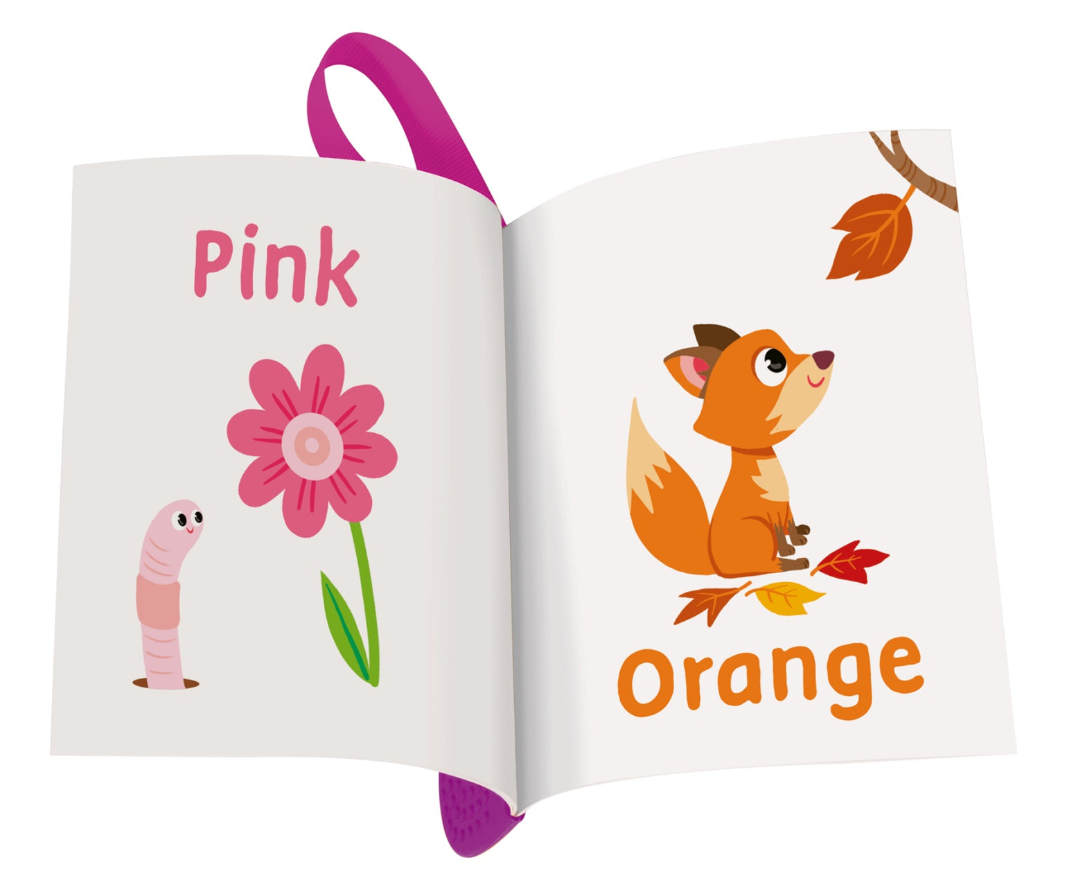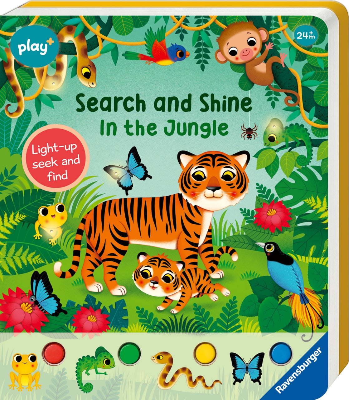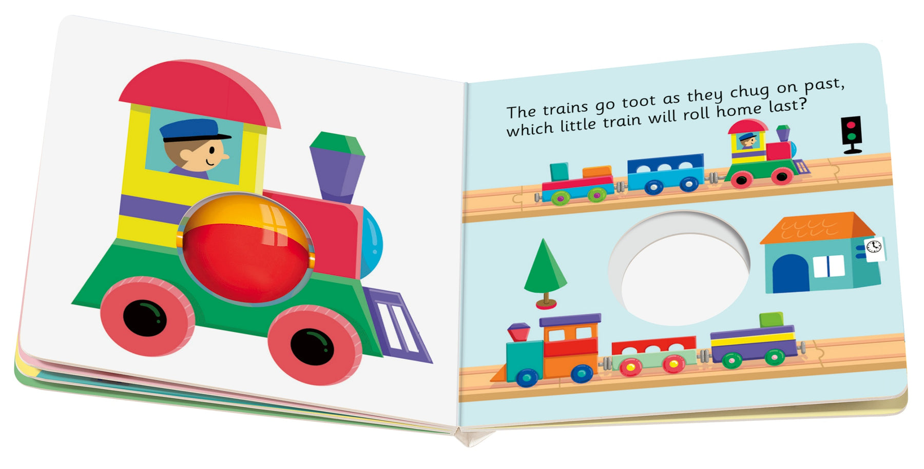 Cardboard book with five double pages, each with a different night-time scene. You then have to find specific things, the owls or the streetlights for example. When you've found them, press the button at the bottom of the page and little lights will shine to show where the items are.
