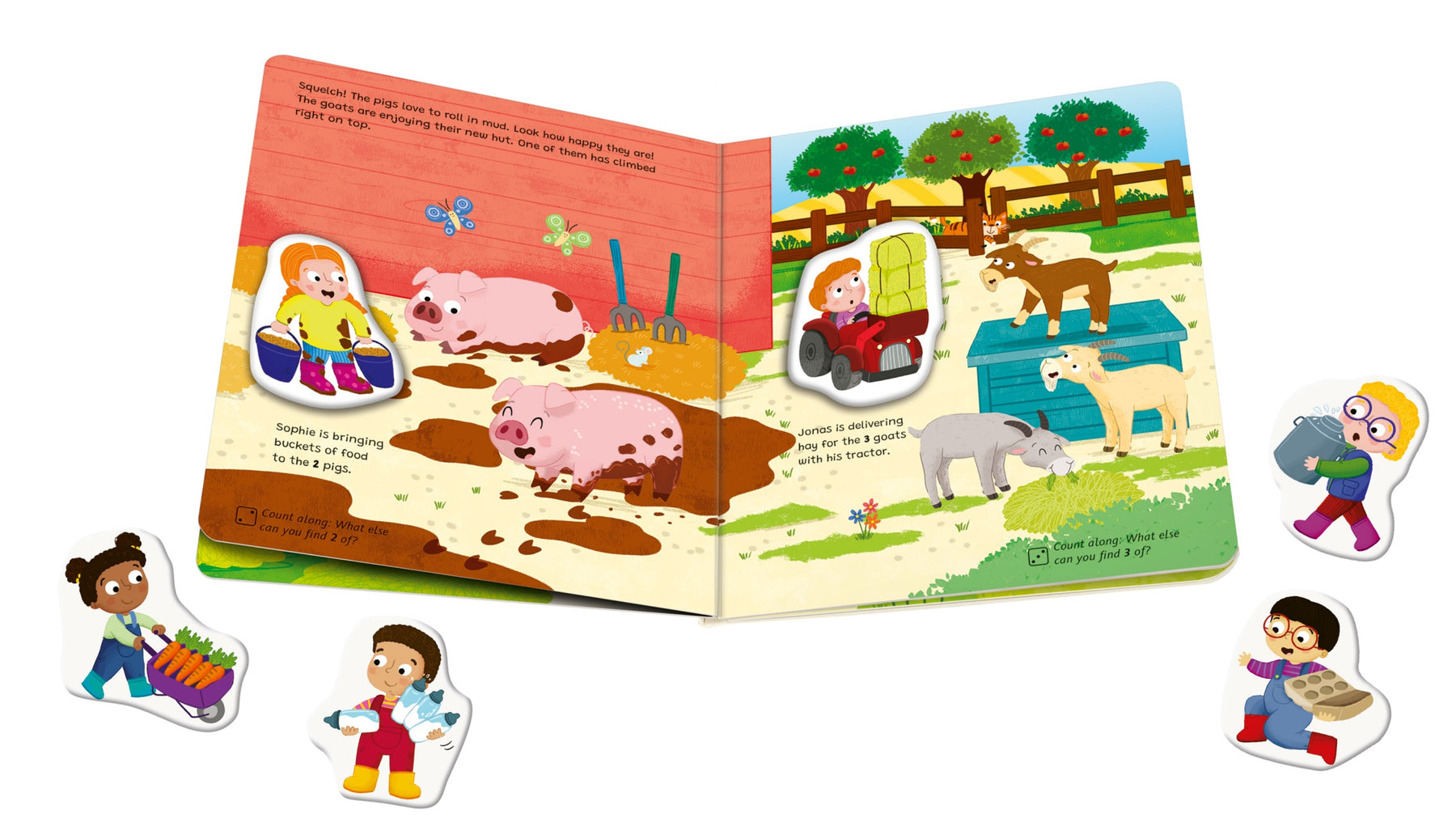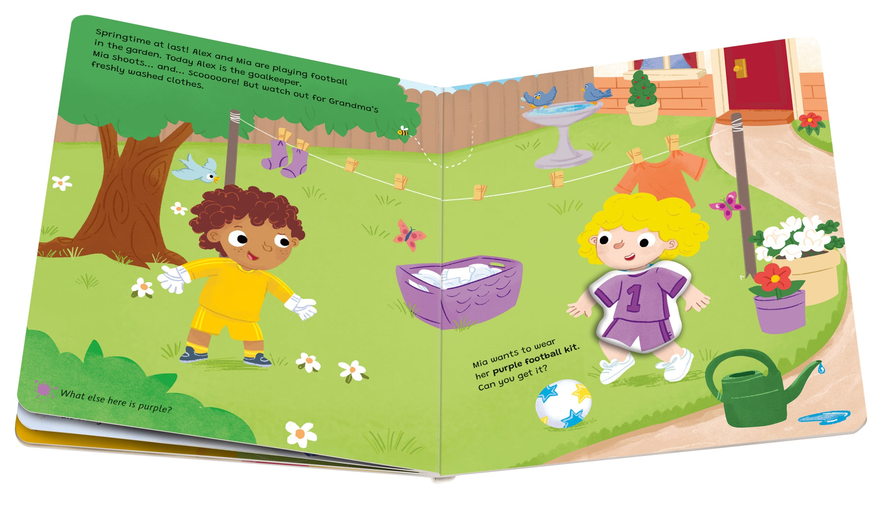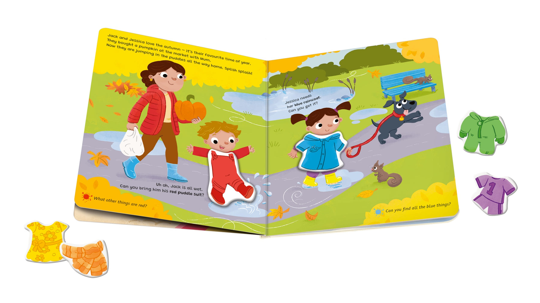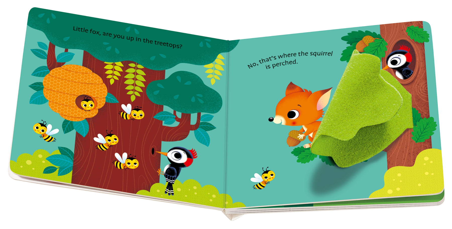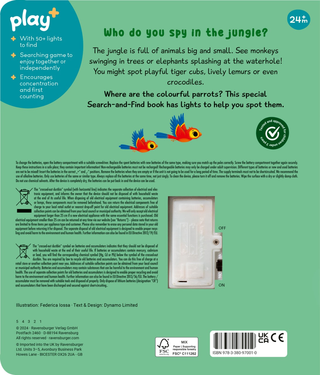 Cardboard book with five double pages, each with a different night-time scene. You then have to find specific things, the owls or the streetlights for example. When you've found them, press the button at the bottom of the page and little lights will shine to show where the items are.