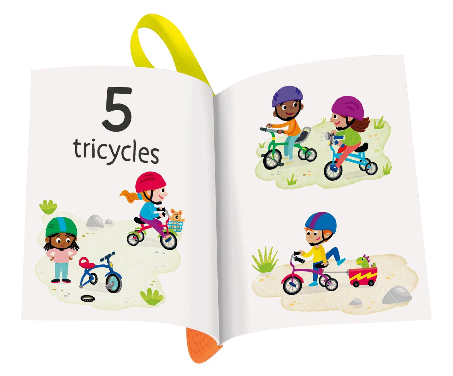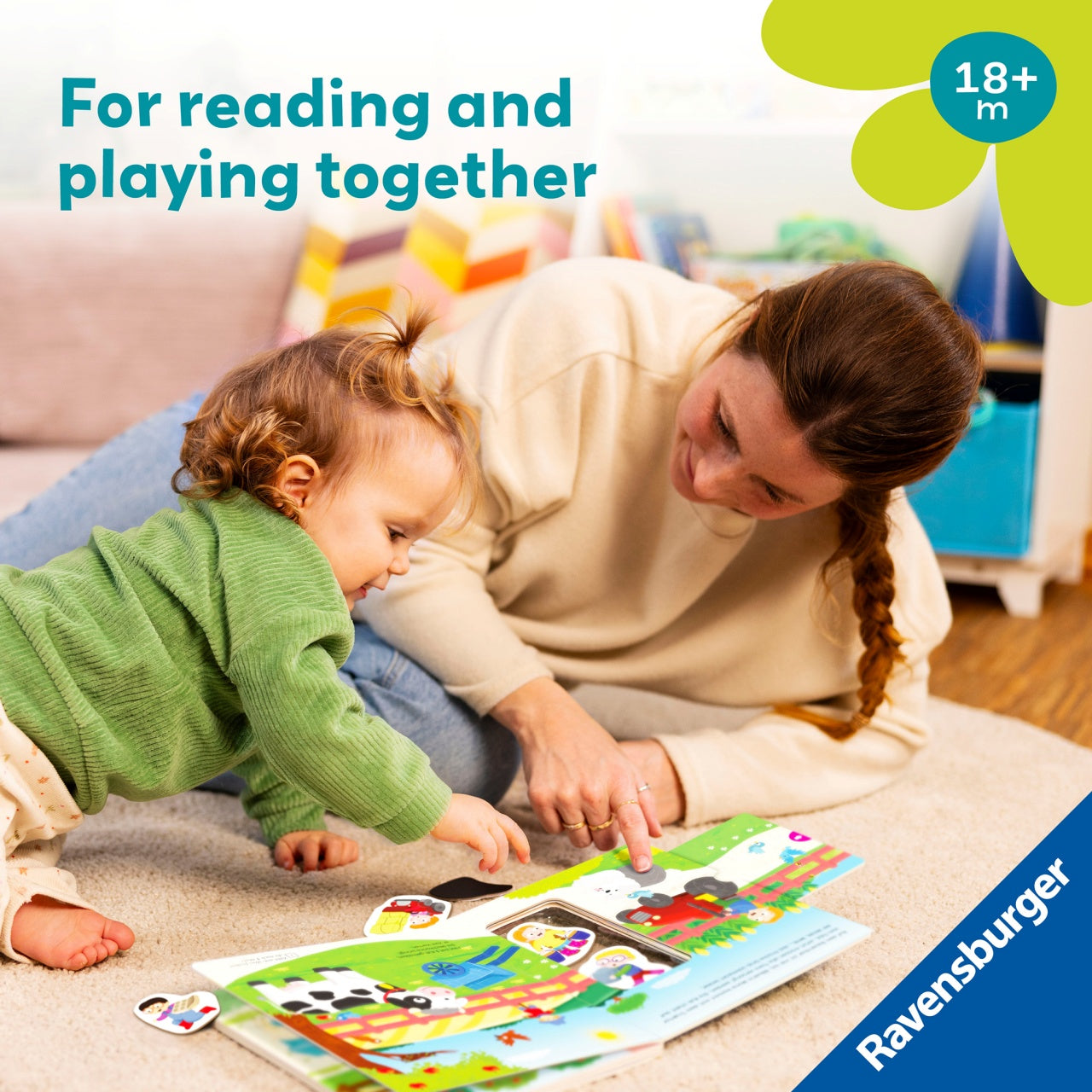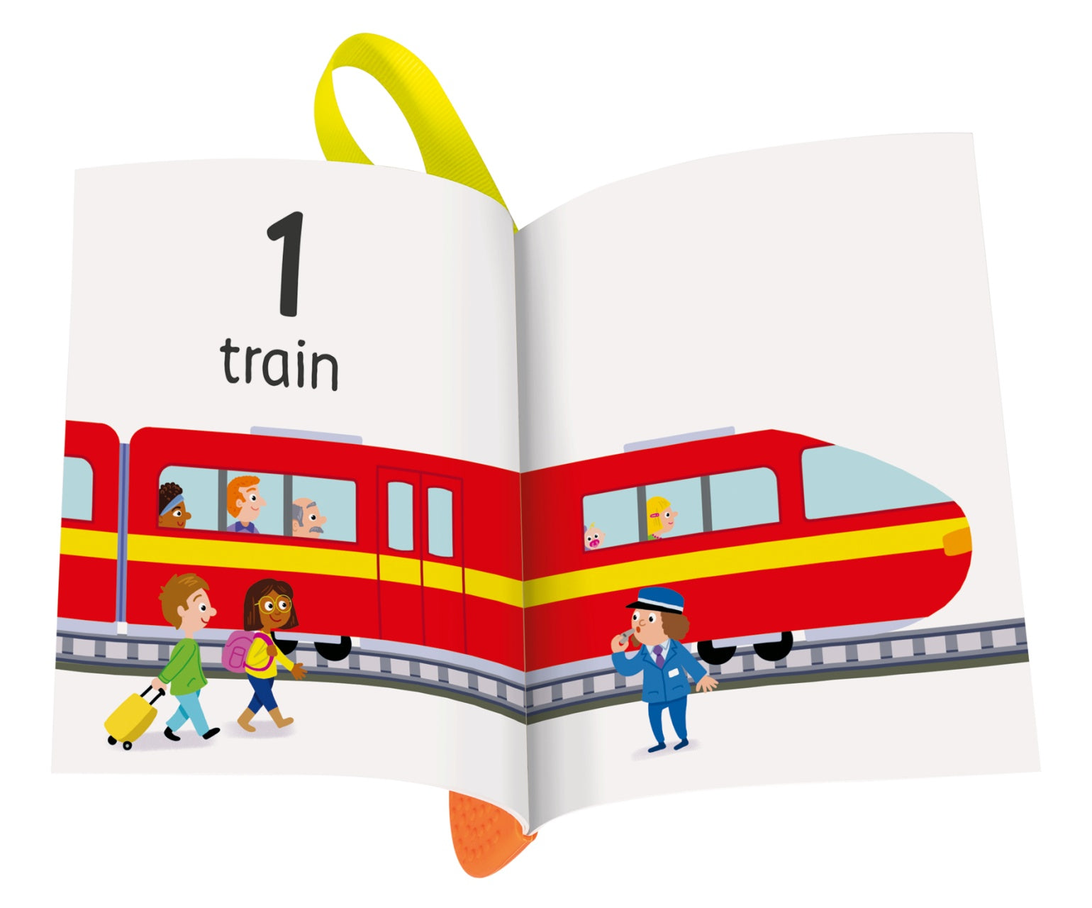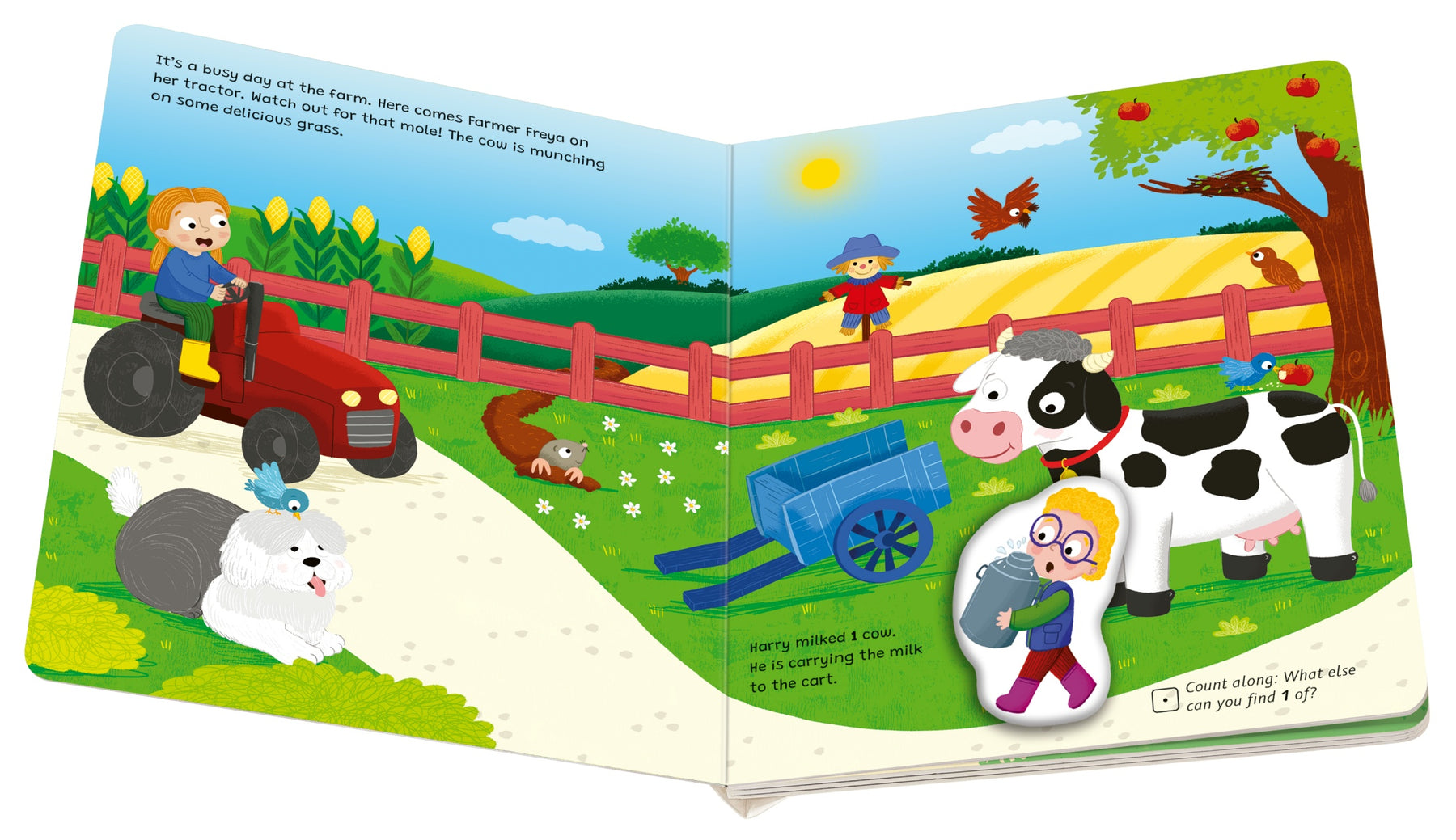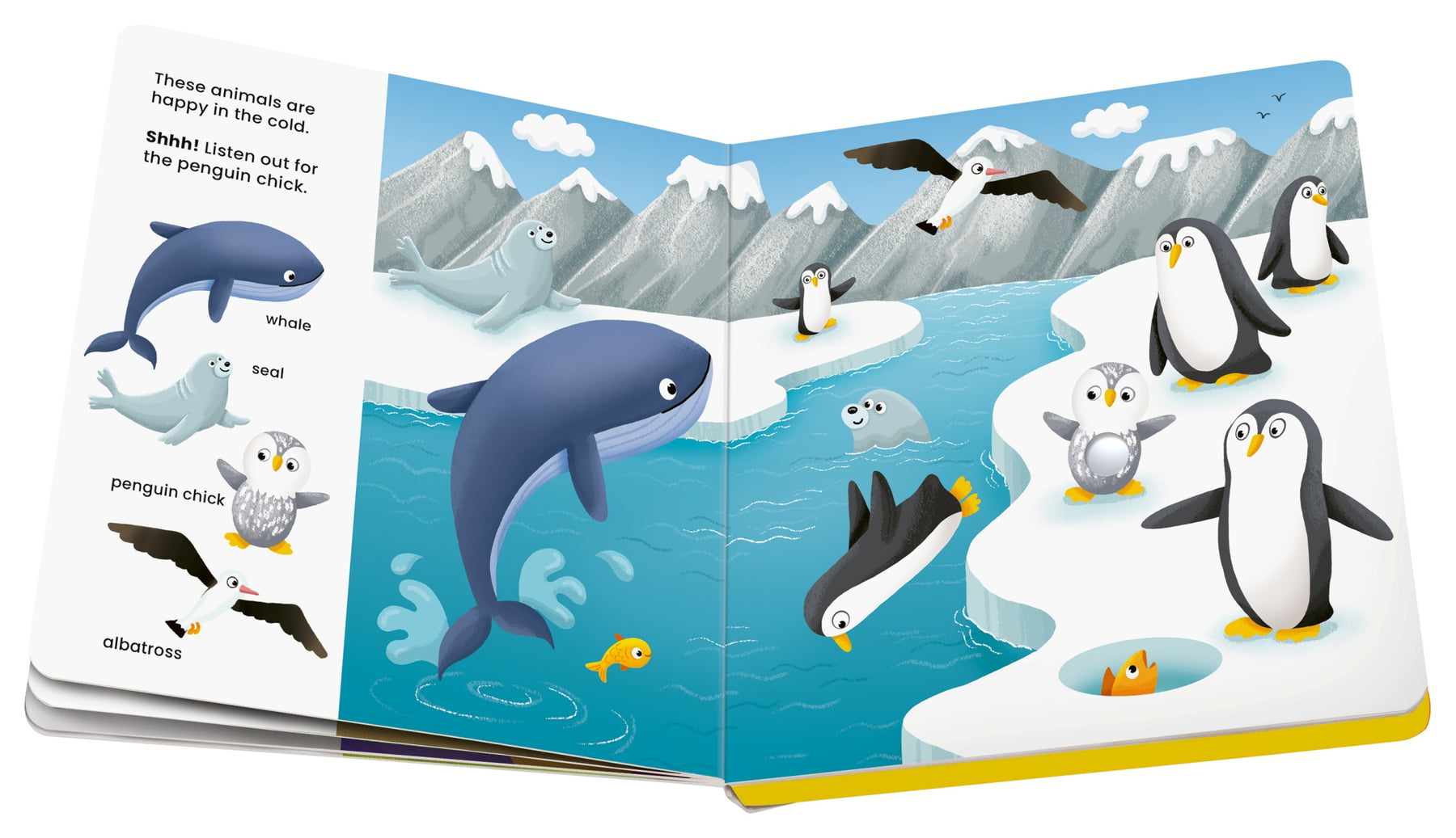 Cardboard book with five double pages, each with a different night-time scene. You then have to find specific things, the owls or the streetlights for example. When you've found them, press the button at the bottom of the page and little lights will shine to show where the items are.