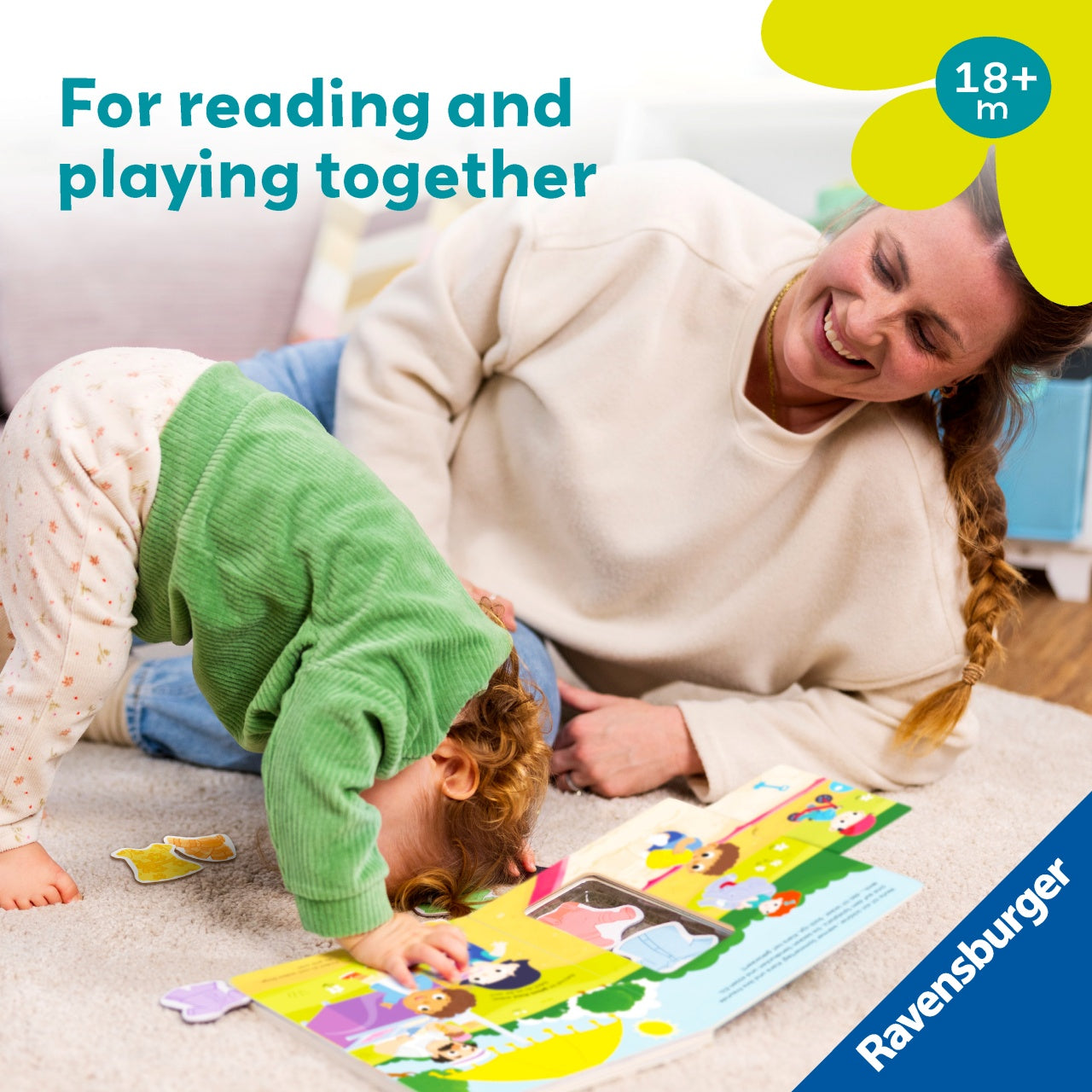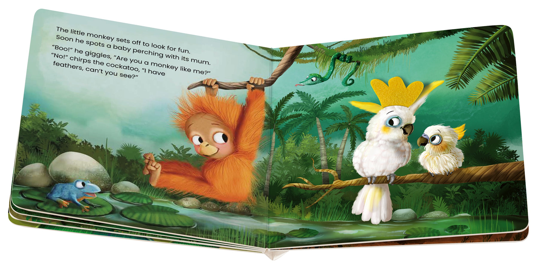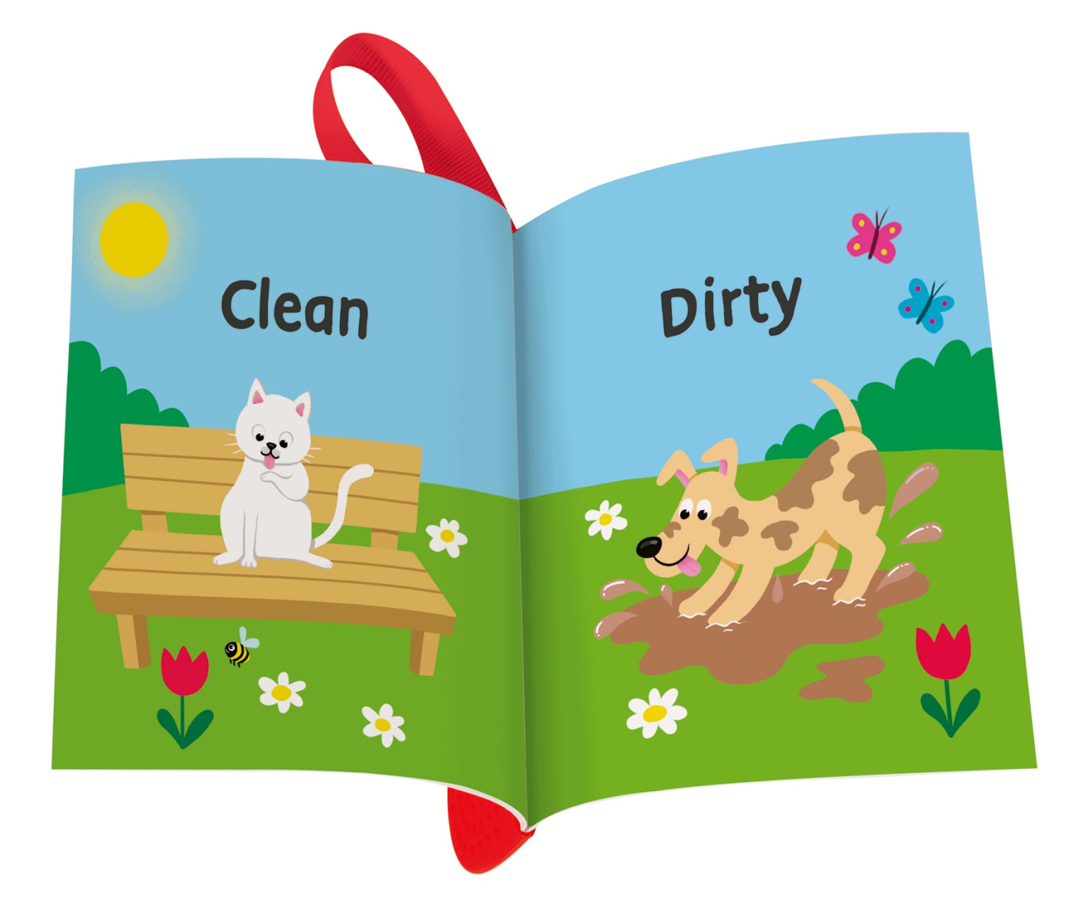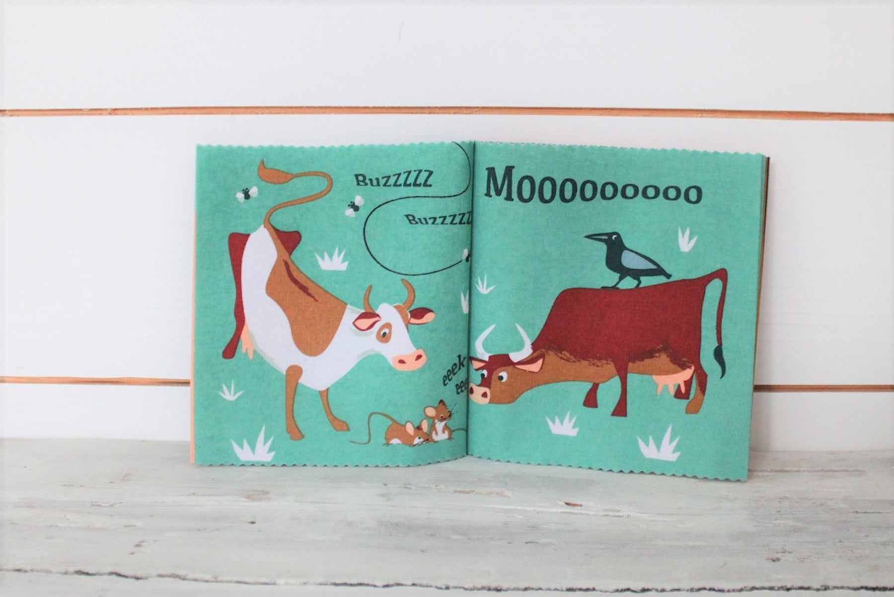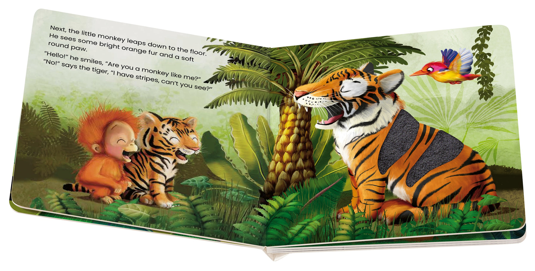 Cardboard book with five double pages, each with a different night-time scene. You then have to find specific things, the owls or the streetlights for example. When you've found them, press the button at the bottom of the page and little lights will shine to show where the items are.