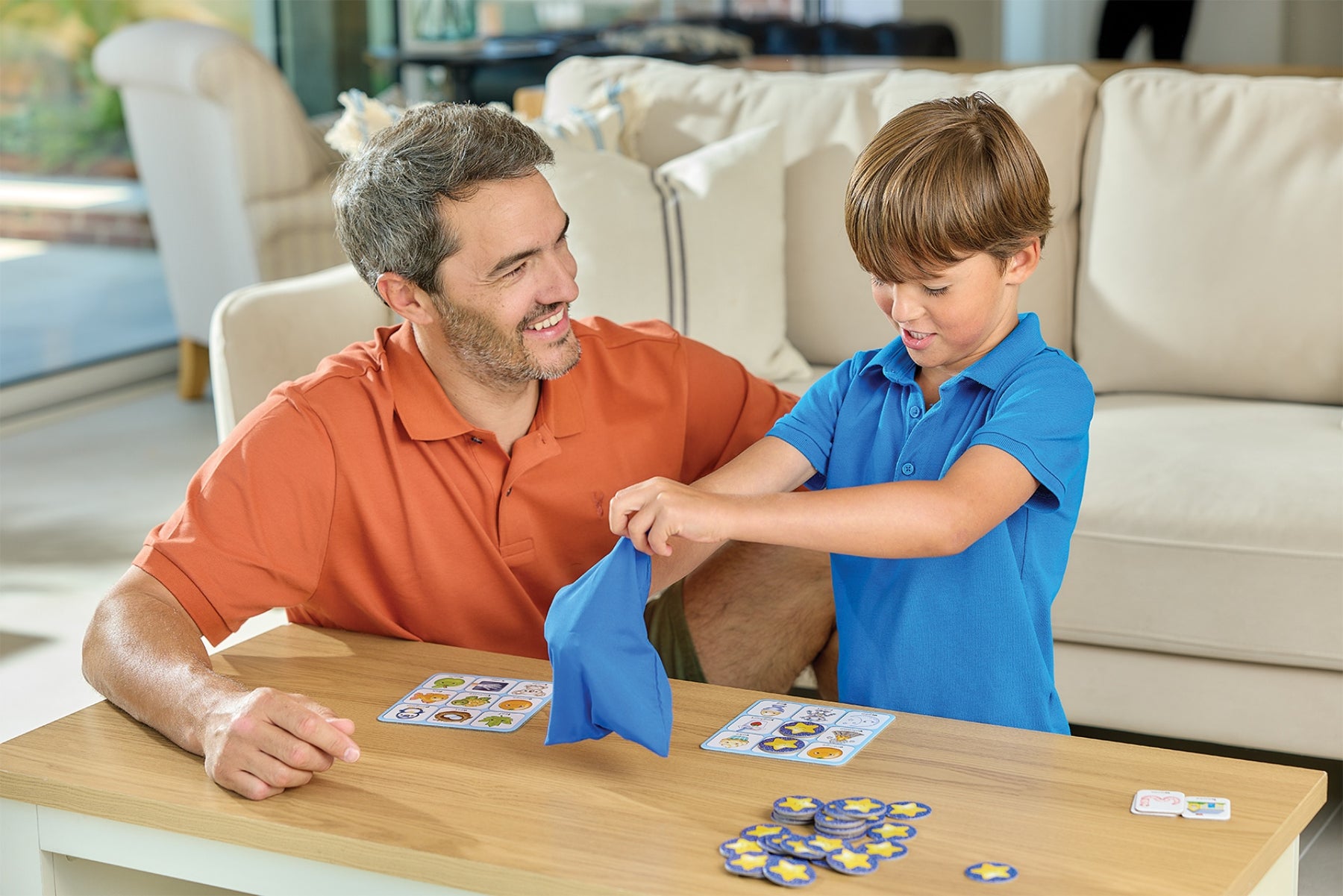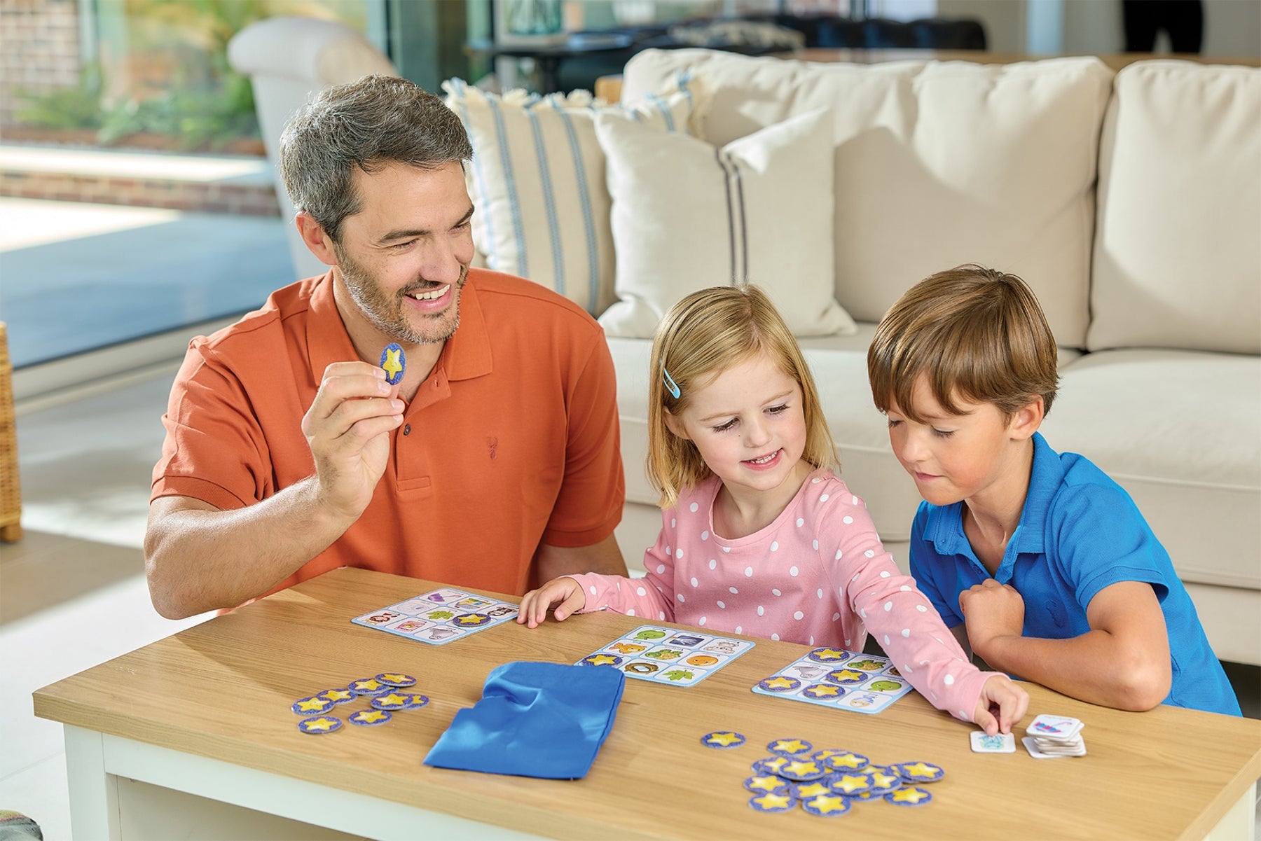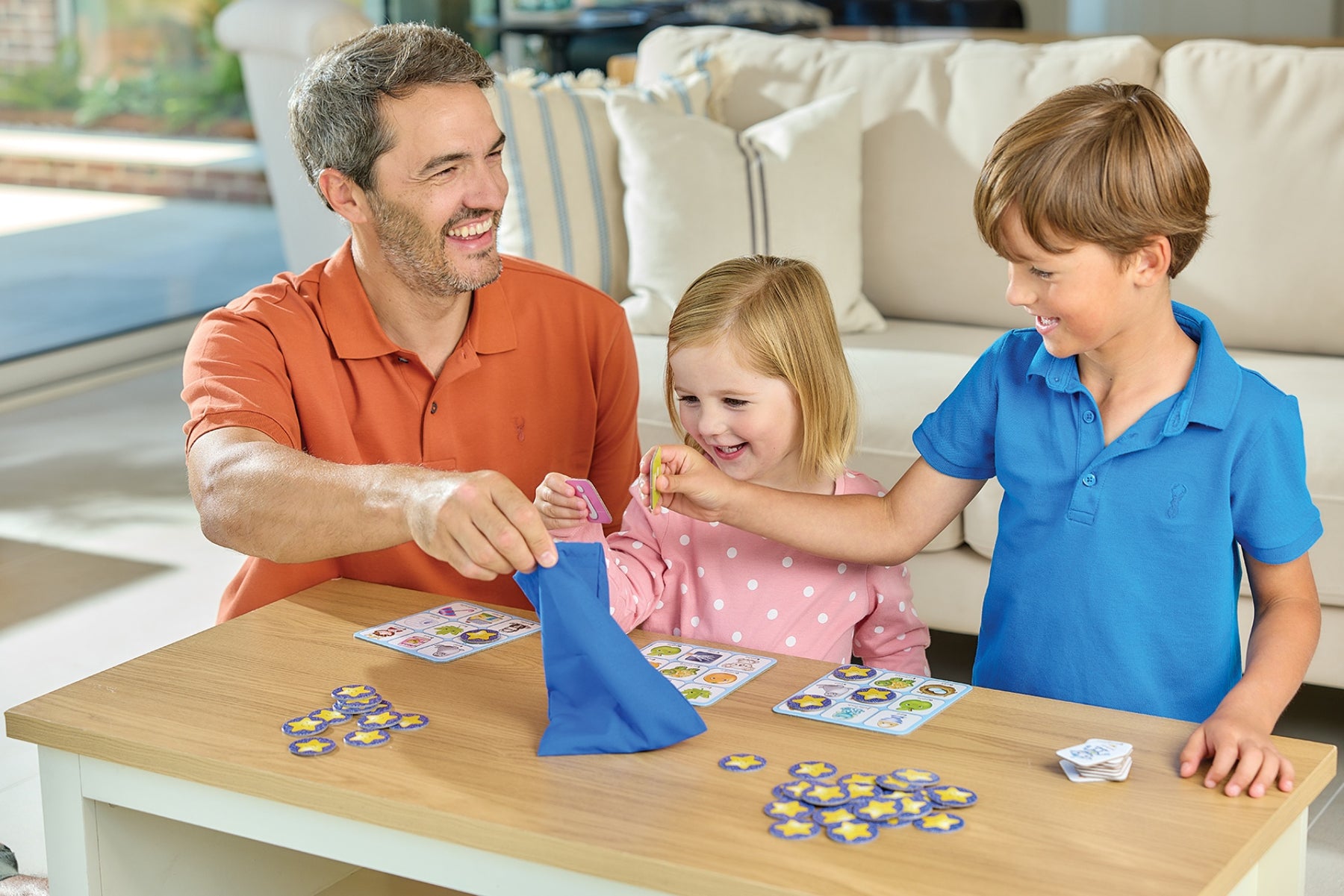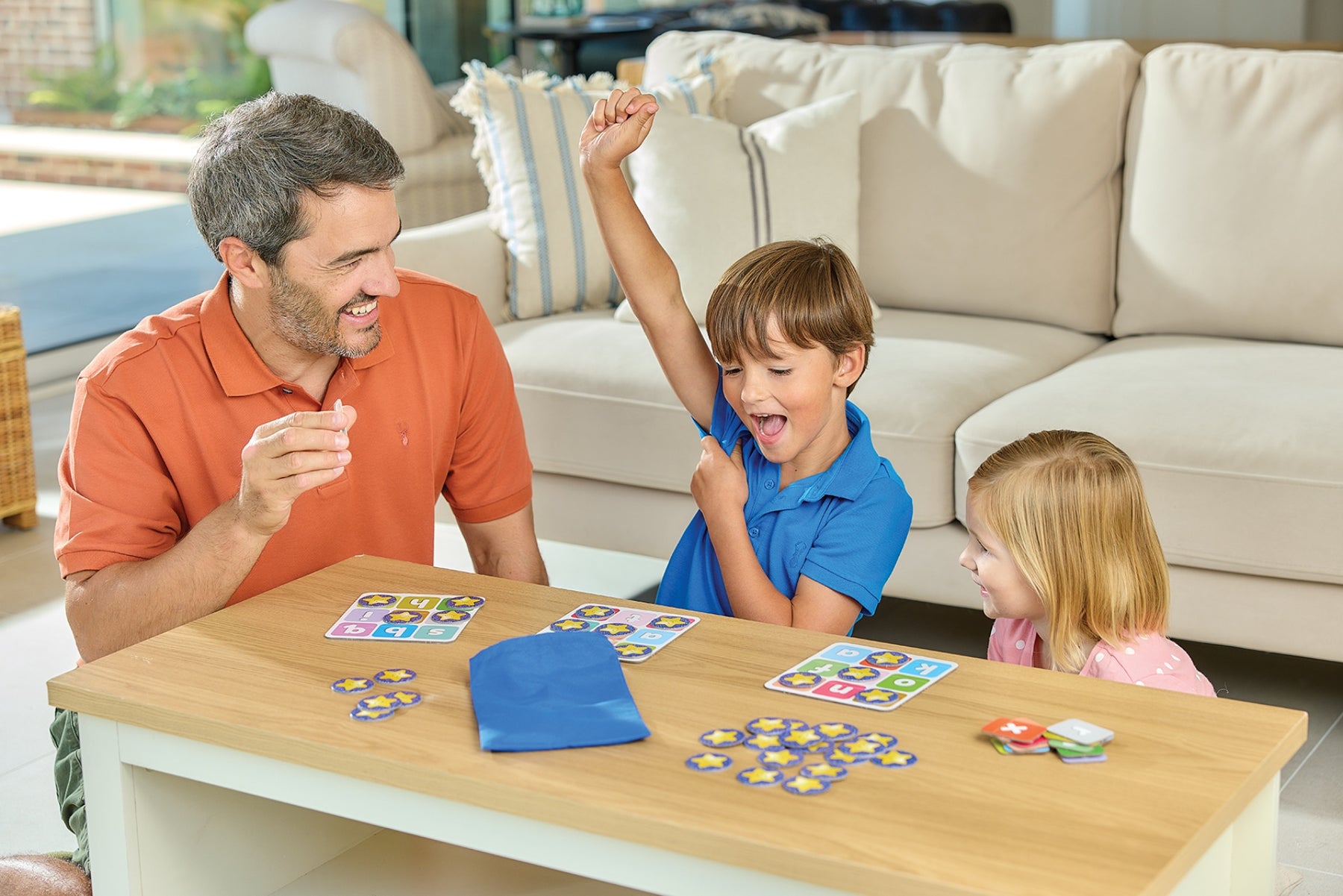Hand out the bingo boards. These are double-sided. On one side are a number of letters, on the other simple pictures (cake, penguin, fish, apple etc.).