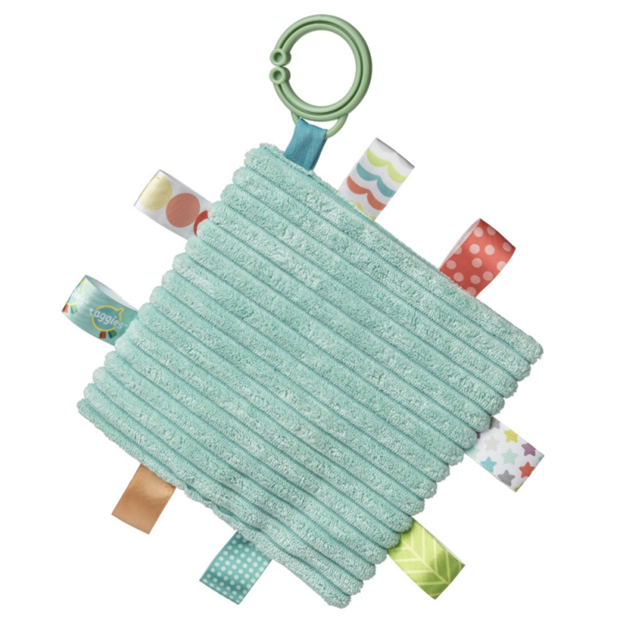 A crinkly, squeaky square with satin tags, sure to fascinate and amuse a young child.