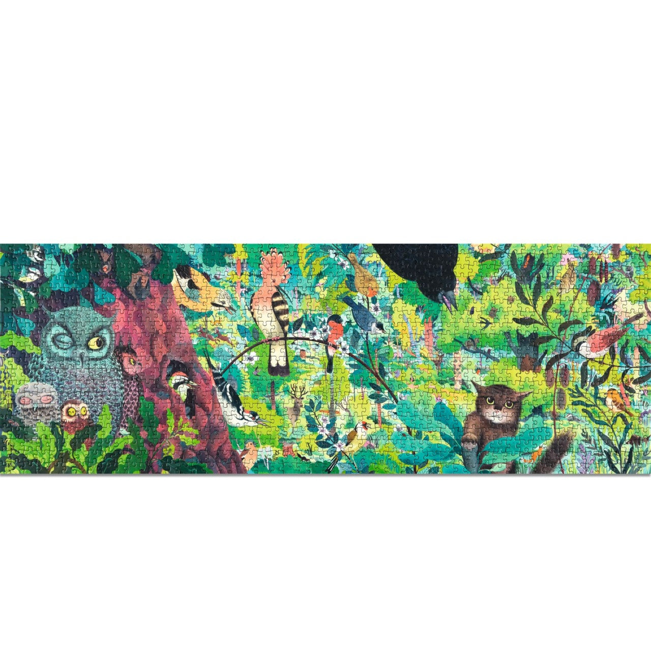 Big, long 1000-piece jigsaw puzzle featuring an owl keeping a beady eye on a cat that is sneaking up on a little bird.