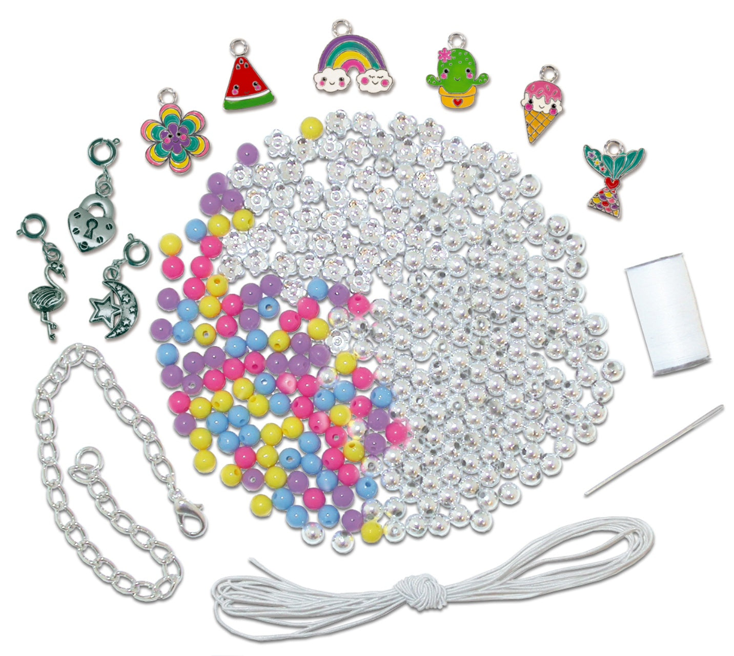 Contains 6 coloured metal charms, 3 silver charms with fasteners, bracelet chain, 300 assorted silver coated and coloured beads, elastic, needle, cotton, guide.