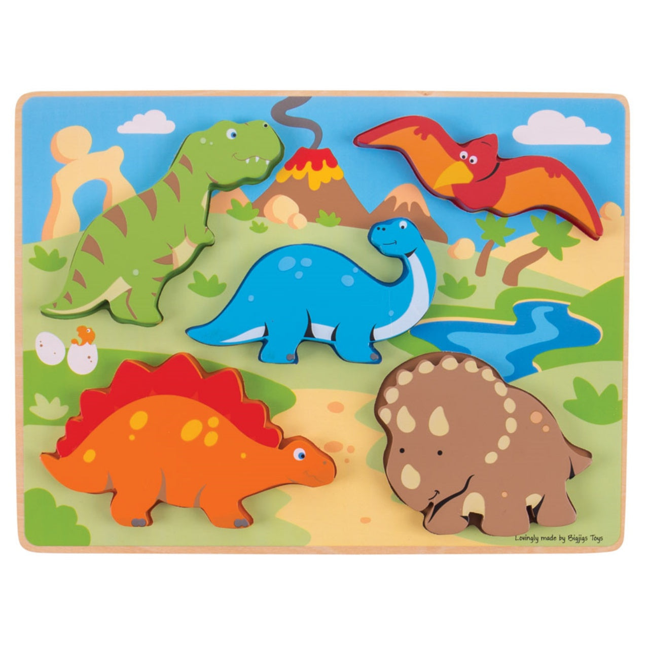Wooden jigsaw with five colourful chunky dinosaur pieces on a prehistoric scene printed on the background.