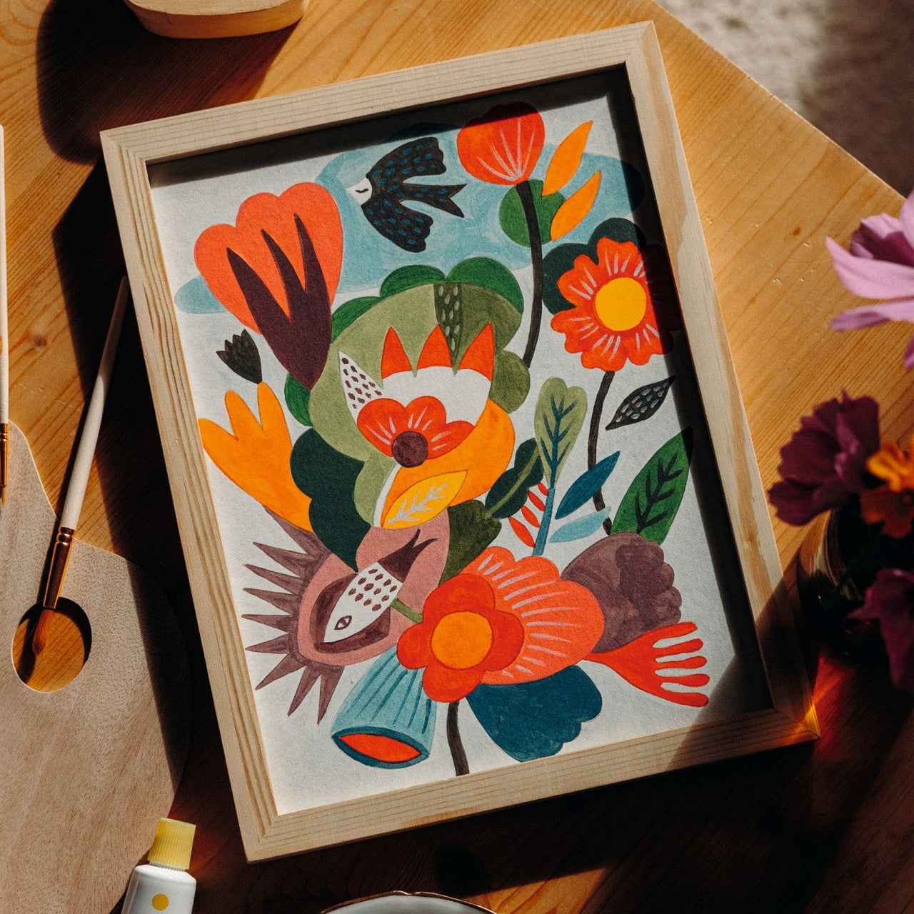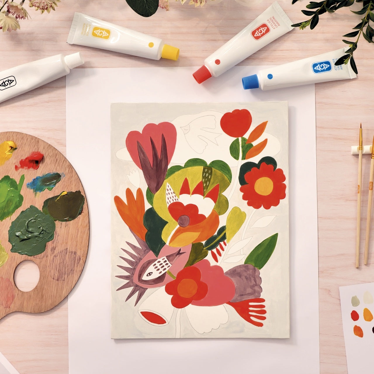 Comes in a lovely box (24.5x31x5.5cm) containing 1 canvas printed with the outline of the illustration to be painted (290 x 220 mm format), 4 tubes of acrylic paint, 1 wooden palette, 3 paintbrushes, 1 paintbrush holder, 1 wooden frame 1 template to follow.