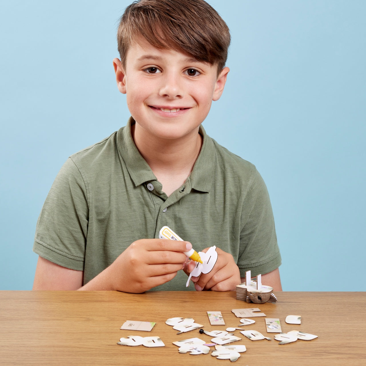 Each pack contains seven pieces of cardboard and a tube of PVA glue.